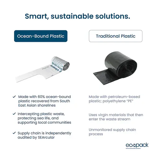 These new bin liners are made from 60% recycled ocean-bound plastic waste. They're the perfect fit for small stand-alone or pull-out bins and feature handles to make them easy to tie off and carry away. Do your part to ebb the flow of plastic waste by using a bin liner made from plastic waste that has been collected from coastal communities, shorelines and riverbanks before it washes out to sea.