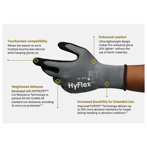 Enhanced comfort: The ultra-lightweight design of the HyFlex 11-571 makes this ANSI/ISEA 105-2024 CUT A4 and EN ISO D industrial glove 20% lighter* without harsh materials.