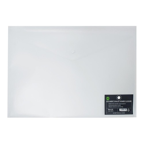 Office Supply Co Domed Document Wallets are made from Polypropylene and keep your documents clean and tidy. Holds up to 100 sheets. A3 size. Clear colour.